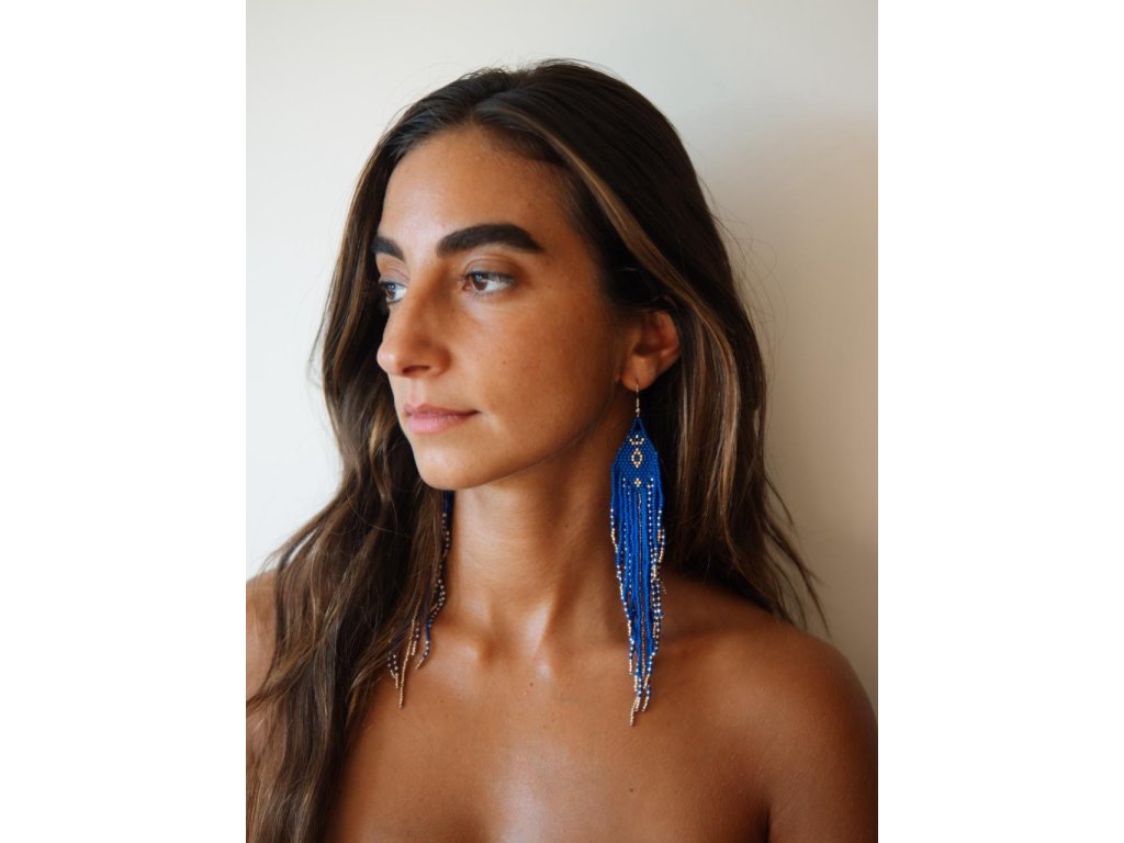 Tyto ručně vyráběné náušnice spojují jemný třpyt zlatých korálků s hlubokou královskou modří, připomínající klid noční oblohy a sílu květu, který se rozvíjí jen v nejčistší vodě.